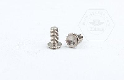 在使用過程中需在基體上開一個(gè)小孔,將壓鉚螺釘放入孔內(nèi),采用鉚壓設(shè)備平行的均勻的在頭部平壓,因壓鉚螺釘?shù)念^部下有齒紋壓花,當(dāng)壓入后,基體在壓鉚螺釘?shù)闹車a(chǎn)生變形,和齒紋發(fā)生咬合現(xiàn)象,從而形成一個(gè)牢固的外螺紋。